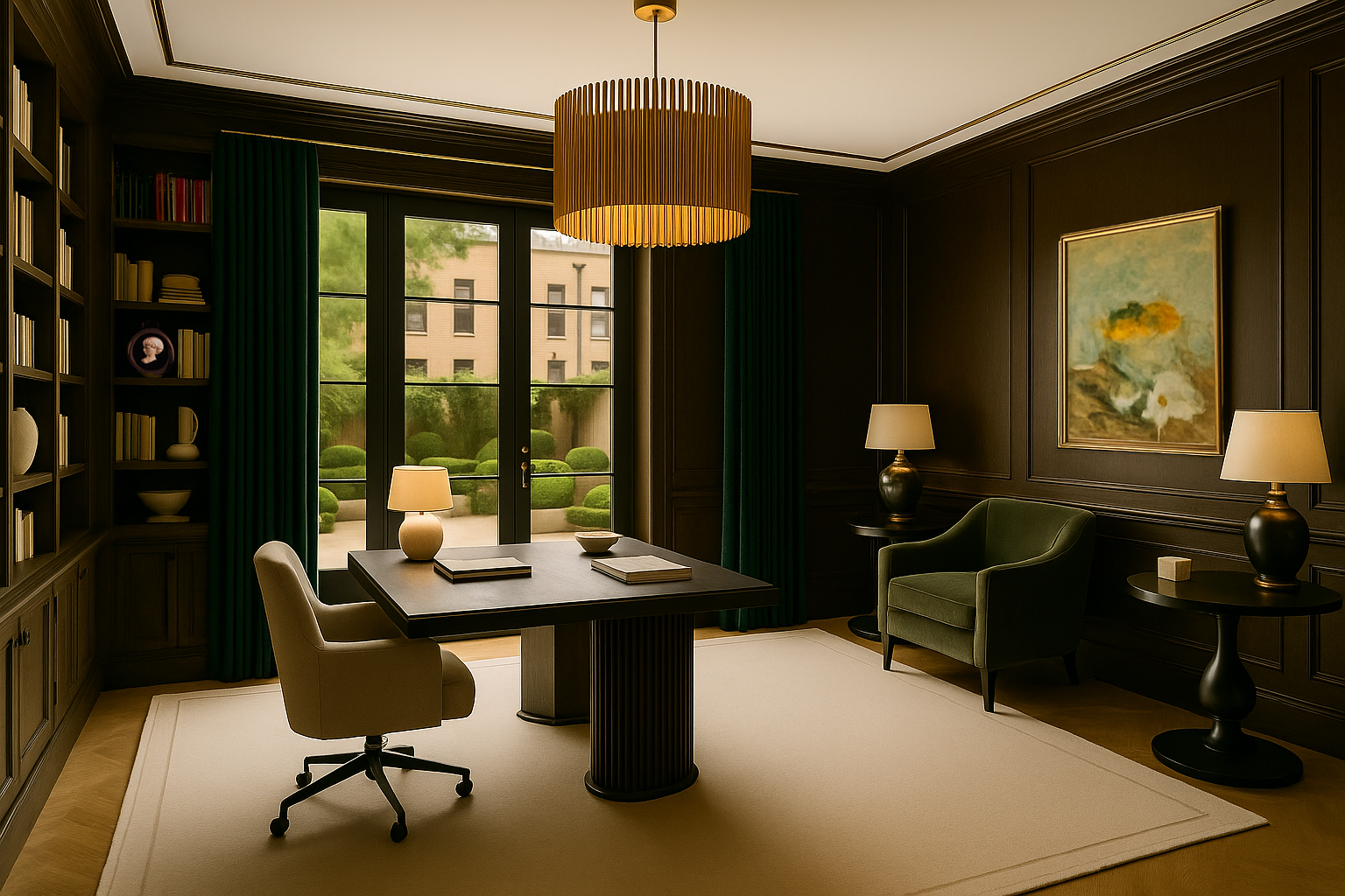 At its center lies the primary sleeping chamber, spanning 15 by 17 feet and set along the historic façade—an enveloping, luminous space where serenity is shaped by proportion and light. Soft morning sun filters through oversized windows; walls may be wrapped in silk or fine lacquer, framed by custom millwork and subtle metallic glints. To one side, a dedicated study or private retreat offers an intimate space for correspondence, reflection, or collection display—echoing the quiet grandeur of a gentleman’s library or an artist’s atelier.